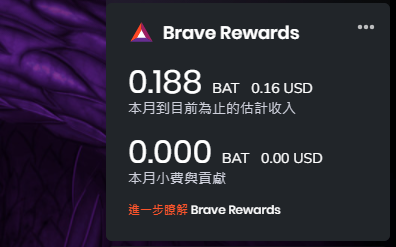實測只是上上網不到一週的時間,就賺取了0.188BAT幣,折合0.16美元,使用者是Brave的第一順位,沒有使用者,有再多內容再多廣告都沒用,使用者在Brave中不再只是眼睜睜的觀望內容創作者與廣告商的金錢往來,大部分廣告收入都被中間人和平台營運商瓜分,現在使用者成為了交易中的一份子,因為使用者的注意,是有價值而應得到回報的。使用者觀看 Brave Ads廣告,會獲得廣告收入中的 70%。BAT幣可以打賞你喜愛的內容創作者,或者是捐助給自己喜歡的網站。